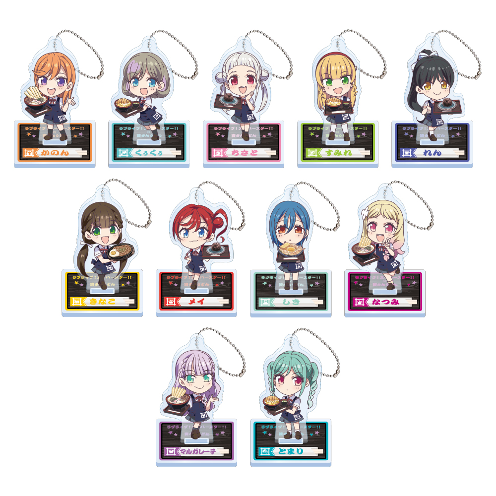店員風衣装で、美味しそうなメニューを持ったLiella!メンバー11名が、コラボデフォルメイラストにて登場!